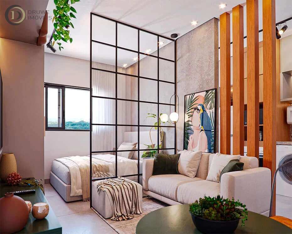 Studio 1 quarto com sala integrada, cozinha moderna e garagem privativa